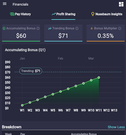Watch your quarterly bonus build up via the “accumulating” bonus tracker. This is the bonus that you have earned so far during the quarter, as each week of your wages adds up. It is calculated using the Bonus Multiplier % generated from the previous quarter OR.
